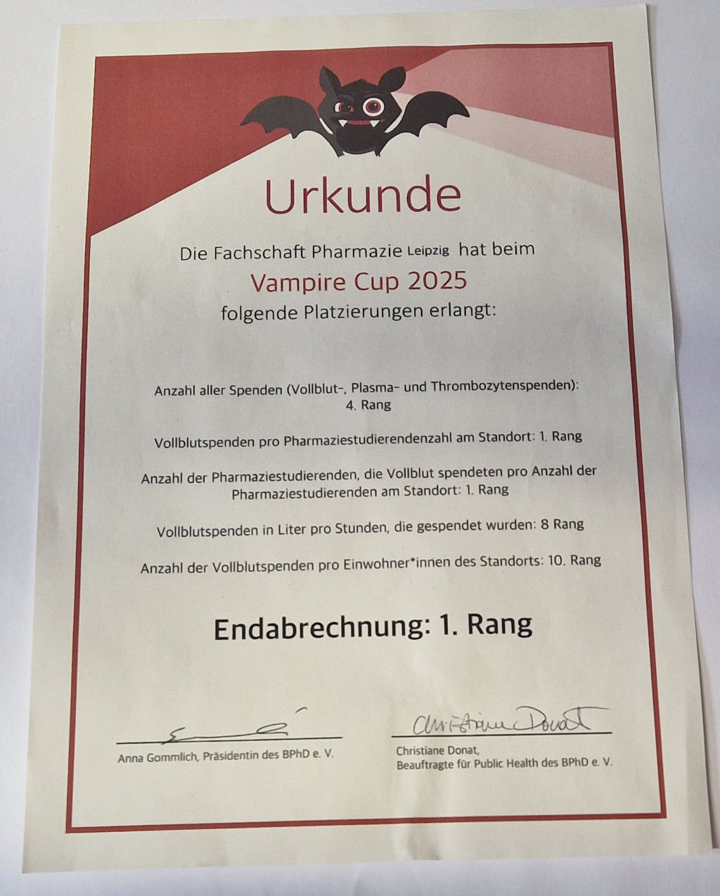 Dafür möchten wir uns herzlich bei allen bedanken, die gespendet haben. Ebenso auch bei der Blutbank des Uniklinikums Leipzig und nicht zuletzt bei der Sächsischen Landesapothekerkammer, die mit ihrer Öffentlichkeitsarbeit und finanziellen Unterstützung maßgeblich zum Erfolg beigetragen hat.