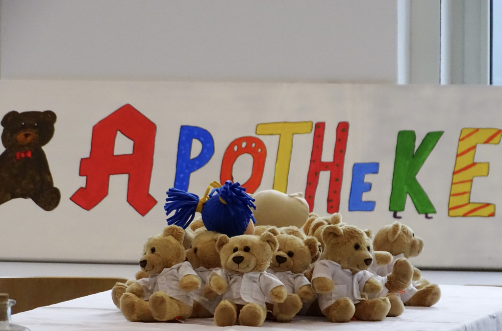 Dort wurden die Kinder von den Teddy-Apotheker*innen in Empfang genommen und konnten ihr zusammen mit den Teddyärzt*innen erstelltes Rezept einlösen. Neben Obst und Tee gab es für die Kuscheltiere liebevoll gestrickte Schals bei Erkältung, Kühlpads bei Verletzungen, Zwieback bei Bauchschmerzen und vieles mehr. Nach dem „Beratungsgespräch“ bekamen die „Teddyeltern“ die notwendigen „Medikamente“ für ihre Lieblinge ausgehändigt.
